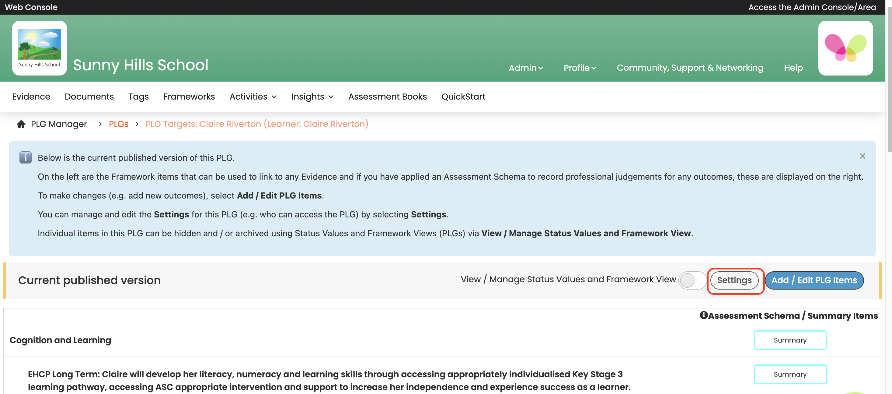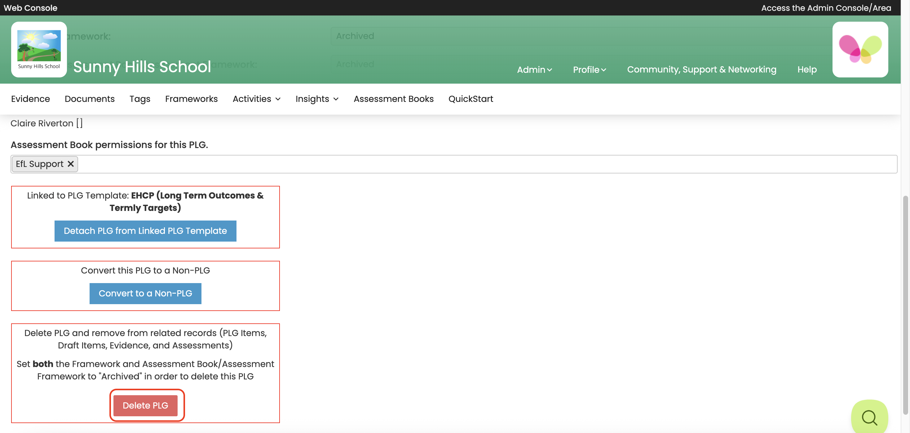 Please note, any Evidence linked to this PLG will have the link removed. Also, any connected Assessments will be deleted. The PLG will also be detached from its template.