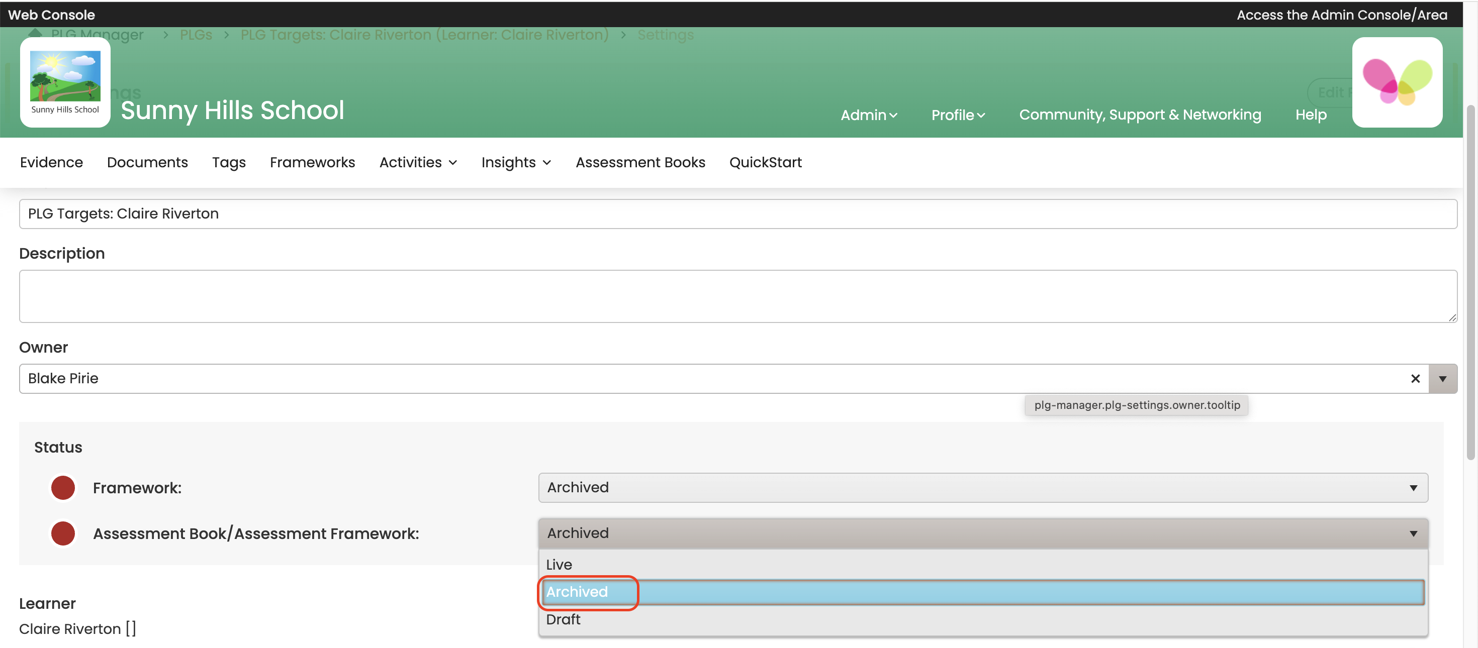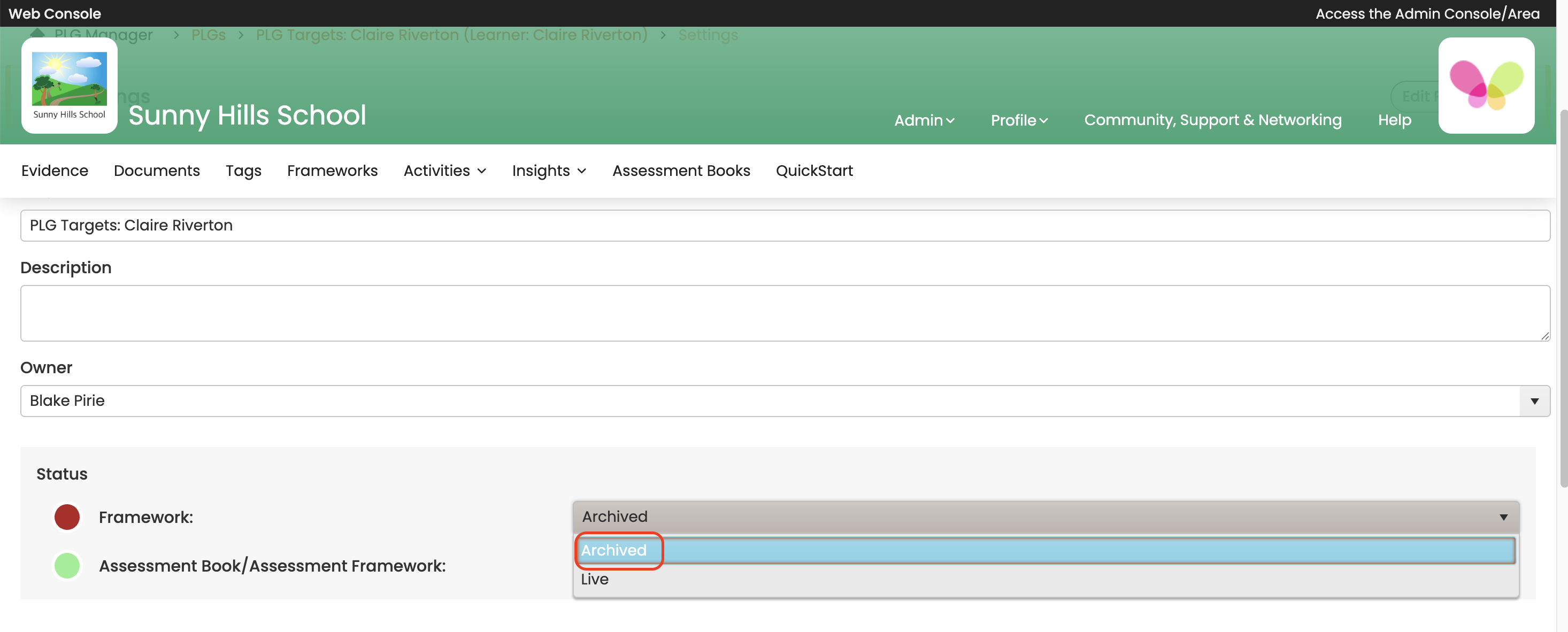 6. Change the Assessment Book / Assessment Framework Status from Live to Archived