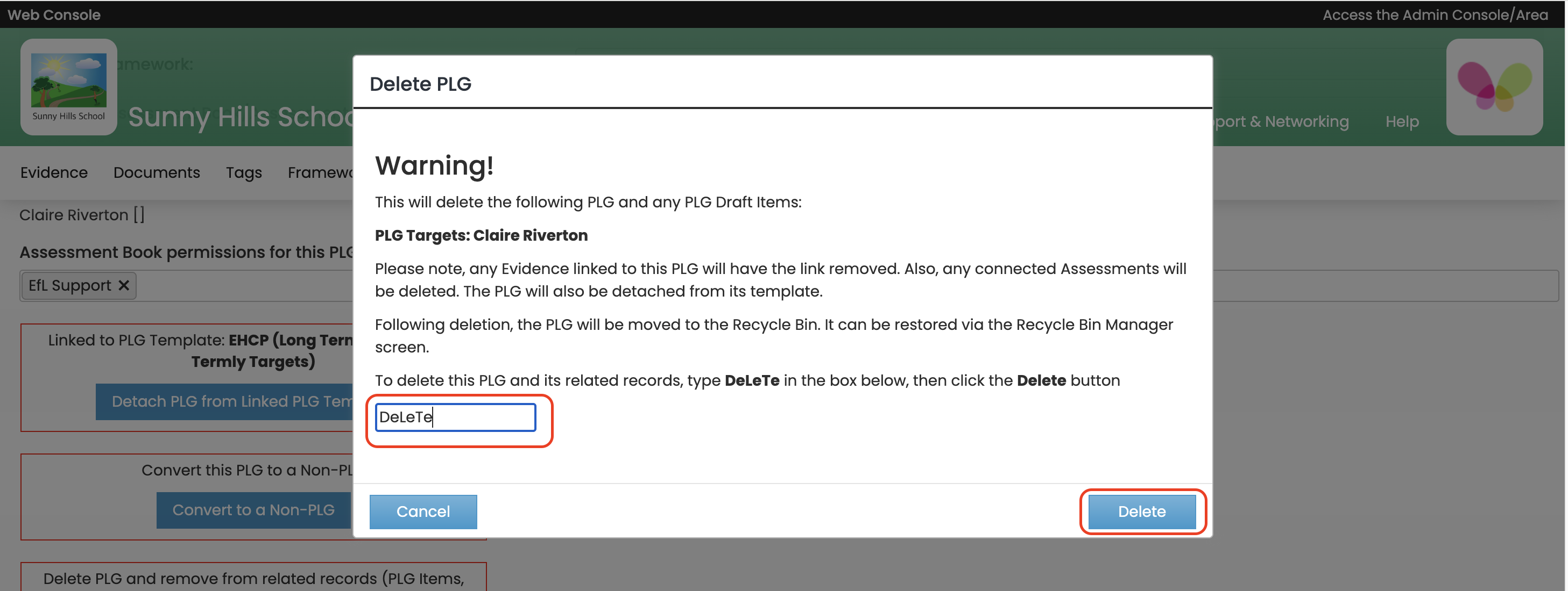 - To delete this PLG and its assessments, type DeLeTe in the box, then click the Delete button