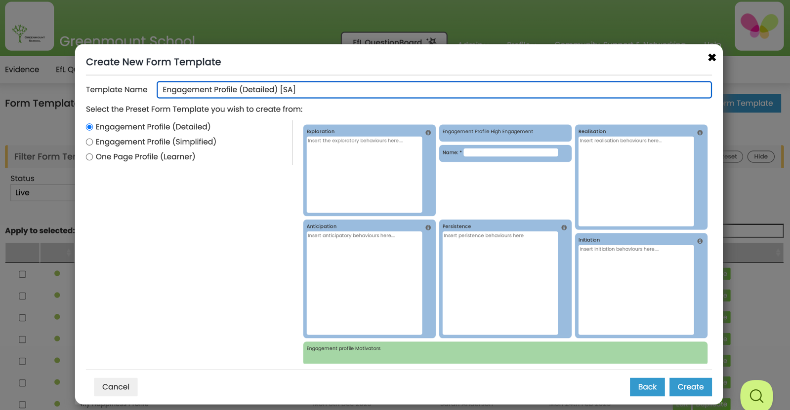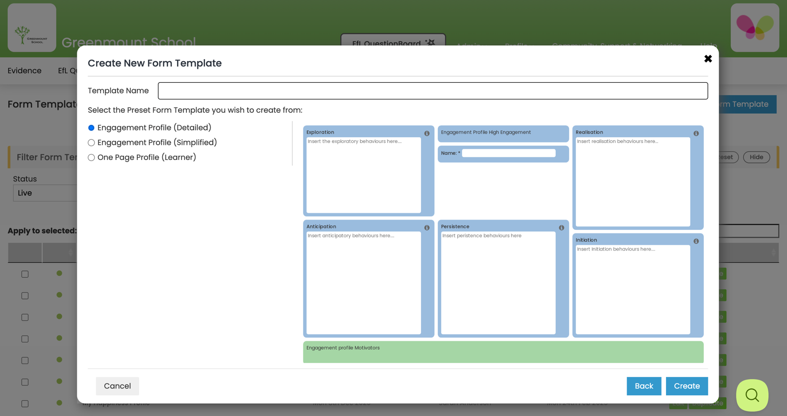 Form Managers create and manage EfL Form Templates. These can be created using a preset template or from a blank canvas. Once a Form Template has been set up Form Users can use it to create EfL Forms for different learners/uses.