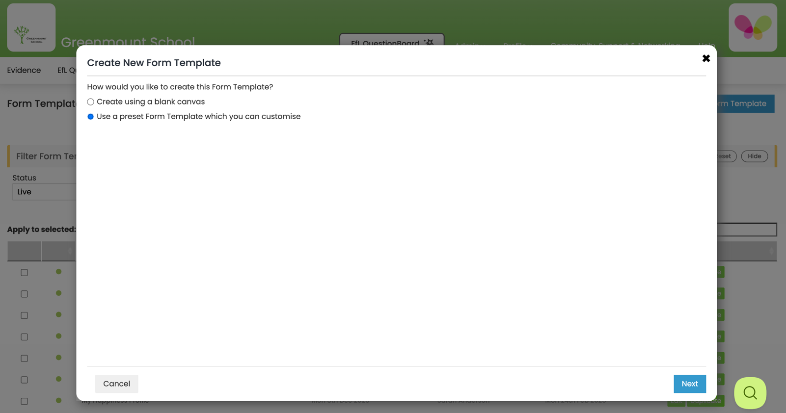 3 In this guide we are Creating a New Form Template from a preset. Select ‘Use a preset Form Template which you can customise’. Click ‘Next’ (bottom right).
