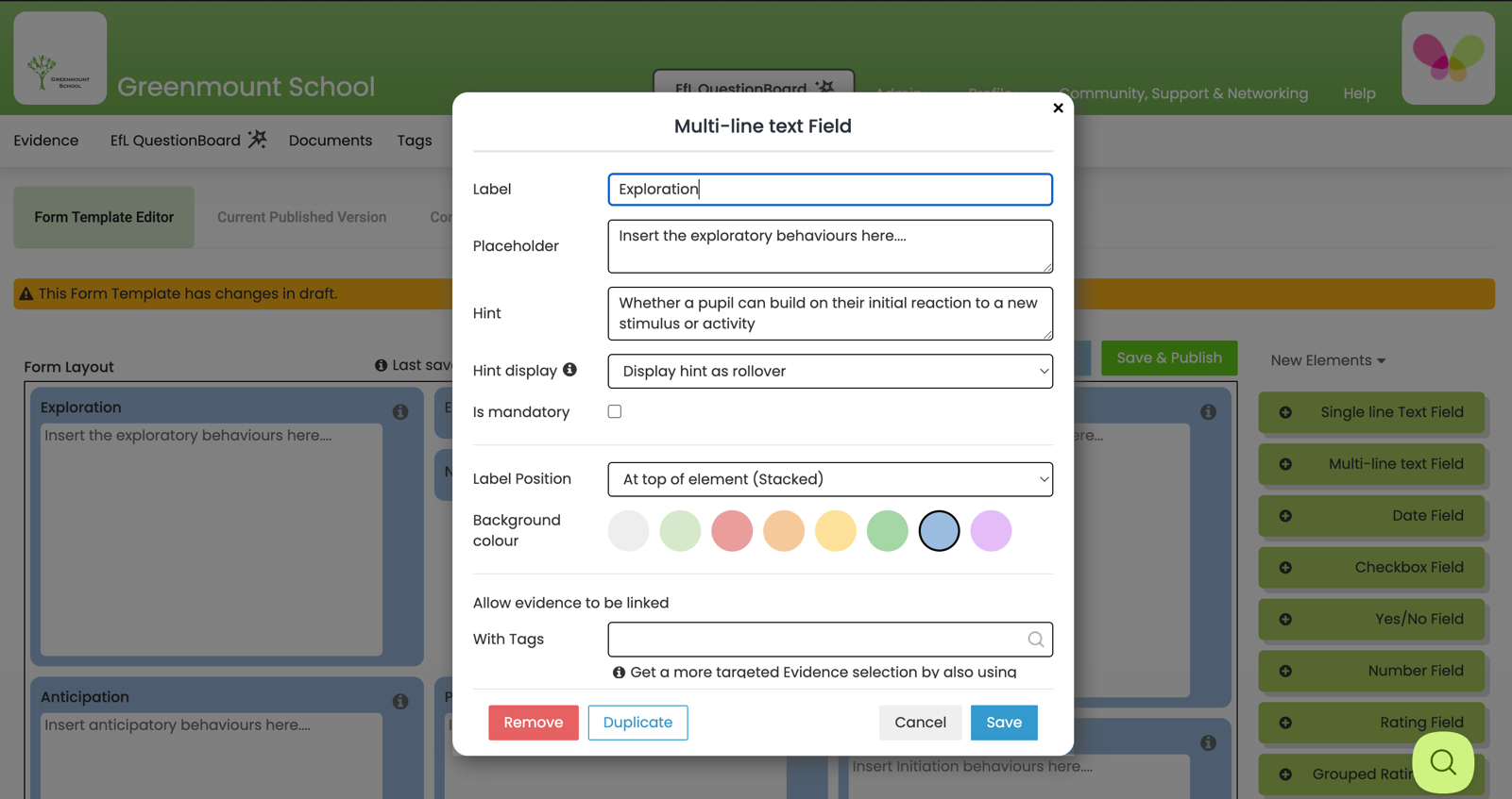 Allow evidence to be linked with Tags – By adding a Tag here you can add specific Evidence to a specific Element. For example, a tag named ENGAGEMENT: Exploration could be created [see Step 2a of the Quickstart Guide on how to create Tags] and used to link Evidence specifically demonstrating Exploration.