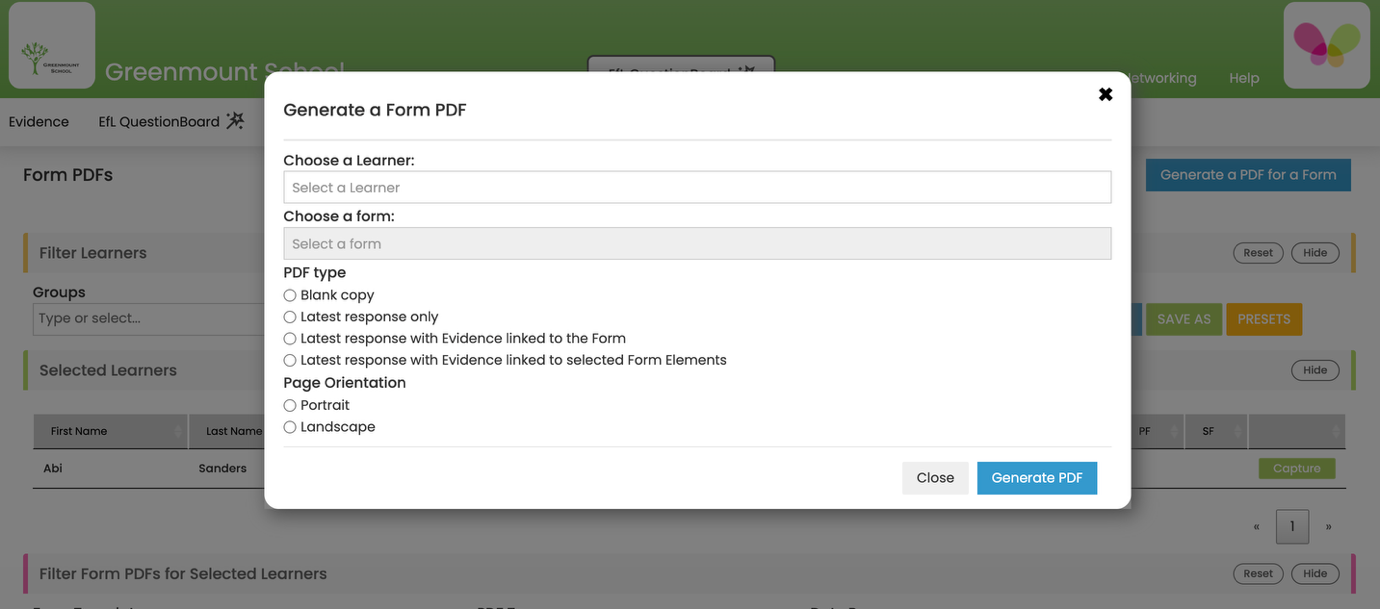 3 A pop-up window will appear with a number of different options. Select your learner, form template, PDF type and Page Orientation.