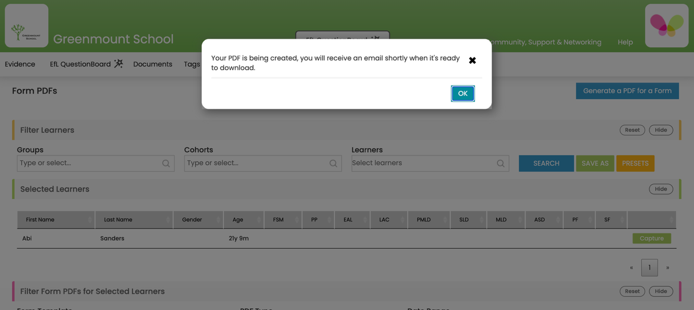 EfL Forms can be exported as PDFs to create a blank copy of a Form, the most recent Form or the most recent Form along with any associated and linked evidence. They can then be saved as PDFs or printed. Blank Forms are useful for making notes on when offline or to send home to parents/carers for information. Printed Forms can be used, for example, as reports, as additional information to be sent home to parents, as part of Annual Review paperwork etc.